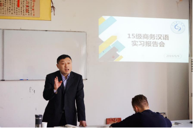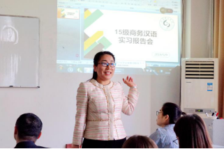 5月9日,太阳集团tcy87222015级商务汉语班在二号教学楼410教室举行实习报告会,太阳集团tcy8722经理纪洪芳、副经理朱光明、教工办相关人员与实习指导老师共同参加。
