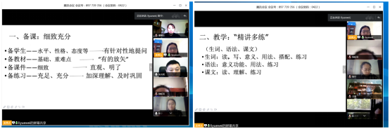 团队分享环节也精彩纷呈。陈宁、刘丽、陈芳芳、王璇、陈虹羽分别代表自己的教学团队,或突出课型特色、或侧重团队合作、或展示教学技巧、或强调员工主体、或探索平台功能、或聚焦考试考核,既有共性的展示,又有特色的分享,其中陈宁对教学内容直观性和形象性呈现的探索、刘丽对钉钉白板的创新性运用、陈芳芳对加强教学主体互动性的尝试、王璇对语言操练途径和方式的挖掘,及陈虹羽就线上听说课教学的反思和改进措施都给大家留下了深刻的印象。