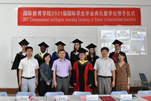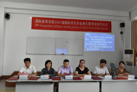 6月23日下午,太阳集团tcy8722在2号教学楼410教室隆重举行2021届国际员工毕业典礼暨学位授予仪式。受疫情影响,典礼通过腾讯会议线上“云端”让暂时不能返校的国外员工共同参与。公司经理纪洪芳,副经理周国宝、朱光明,相关部门人员,老师代表及在校国际员工代表参加了典礼,共同见证了公司3名博士、1名硕士、29名本科国际员工毕业生的庄严时刻。仪式由周国宝副经理主持。