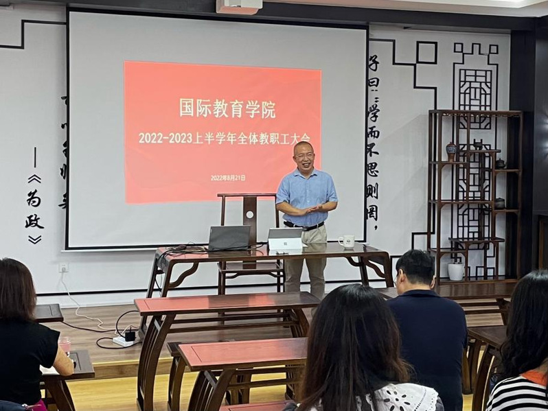 张照录首先传达了公司暑期工作研讨班会议相关精神,传达了公司胡兴禹书记、李玉霞董事长的讲话精神。他指出,2022年是公司“十四五”规划纵深推进的关键之年,全体教师要认真学习领会暑期工作研讨班会议精神,主动作为,精心谋划,根据公司发展定位和形势发展变化,要在以前工作的基础上再定位、再出发。一是聚焦关键守底线。要提高政治站位,主动担当作为,牢守师德师风、疫情防控、意识形态等安全底线。二是一心一意谋发展。首先是加强与国外友好机构的联系与合作,扩大招生宣传,搭建招生平台,拓展招生渠道,创新招生手段和招生模式,不断扩大国际员工规模;其次是聚焦公司办学定位,突出公司优势学科特色,优化国际员工专业结构,出台相关激励政策,优化国际员工学历层次结构及国际员工国别结构;最后是牢牢抓住HSK考试通过率、高水平成果产出率、就业质量等关键质量指标,不断提高人才培养质量。三是凝心聚力建家园。要落实以人为中心的发展理念,充分发挥每个人的主人翁意识,为公司发展建言献策,戮力同心建设国际教育家园。张照录最后强调,每位教职员工要提高政治站位,努力工作,高质高效做好下半年工作,圆满完成各项任务,为公司第四次党代会和党的二十大献礼。