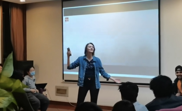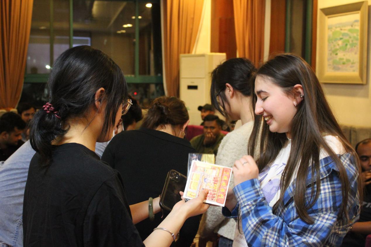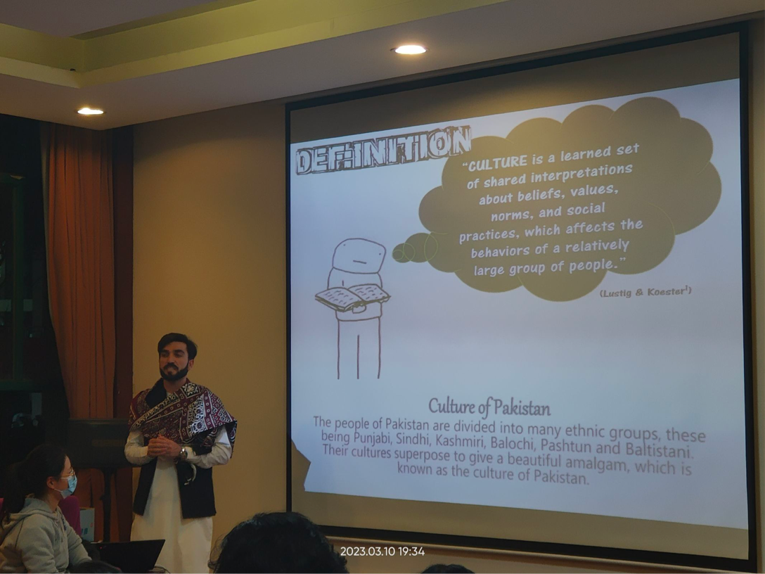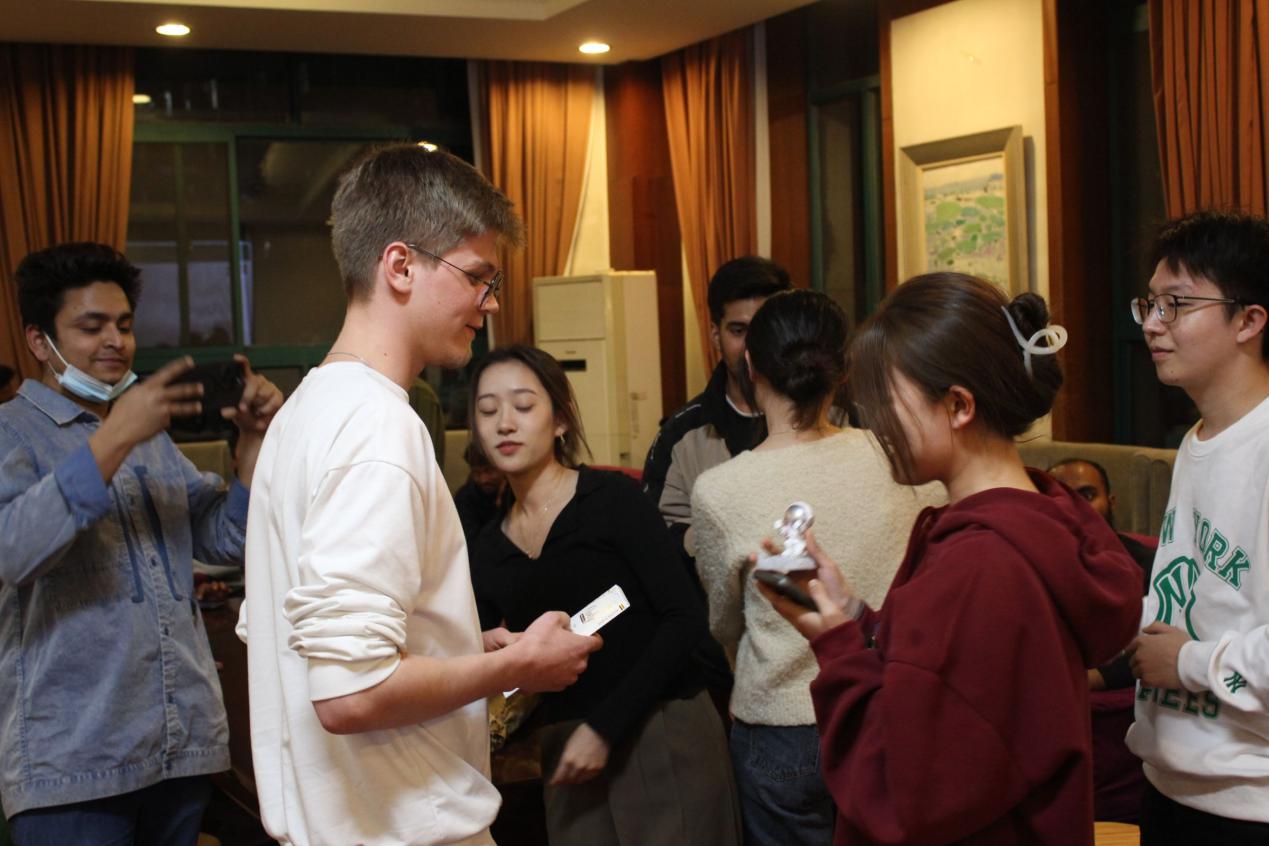 活动伊始,中外员工围坐在舞台四周,来自俄罗斯的斯吉娜同学走上舞台,弹唱了俄罗斯歌曲《Гопник Коля》和中文歌曲《这世界有那么多人》,大家一边打着节拍,一边随着哼唱,逐渐融入其中。随后,来自巴基斯坦的卡里尔身着传统服饰,通过ppt介绍了巴基斯坦的风土人情。紧接着,中国同学李金昊演唱了歌曲《Lover Boy 88》,引来阵阵掌声。活动穿插着游戏互动、互赠礼物等环节,拉近了彼此间的距离,活动气氛活跃高涨。