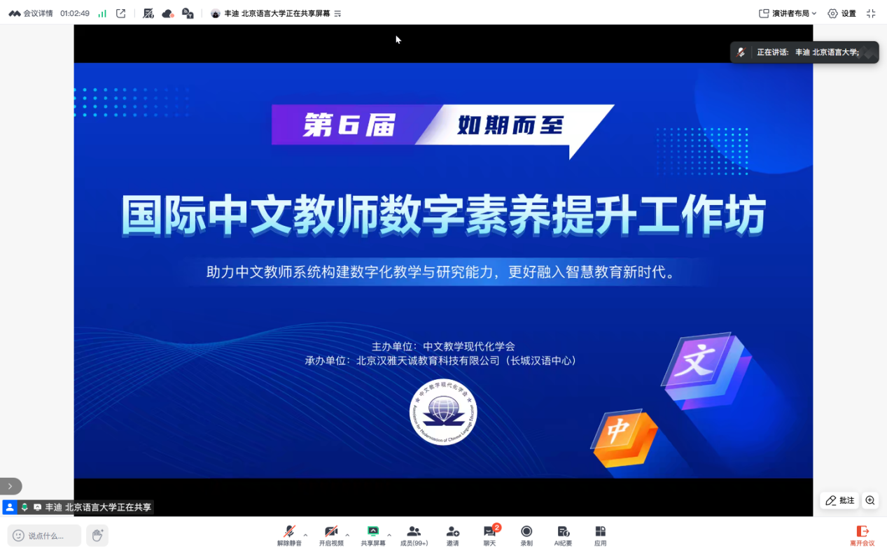 此次培训以《国际中文教师数字素养参考框架(2025年版)》指标维度为核心,聚焦数字化认知、数字化知识与技能、数字化应用、数字化发展全链条,涵盖专家导学、青年示学、学术研究与朋辈沙龙等,全面提升参与者的数字化教学与科研能力。
